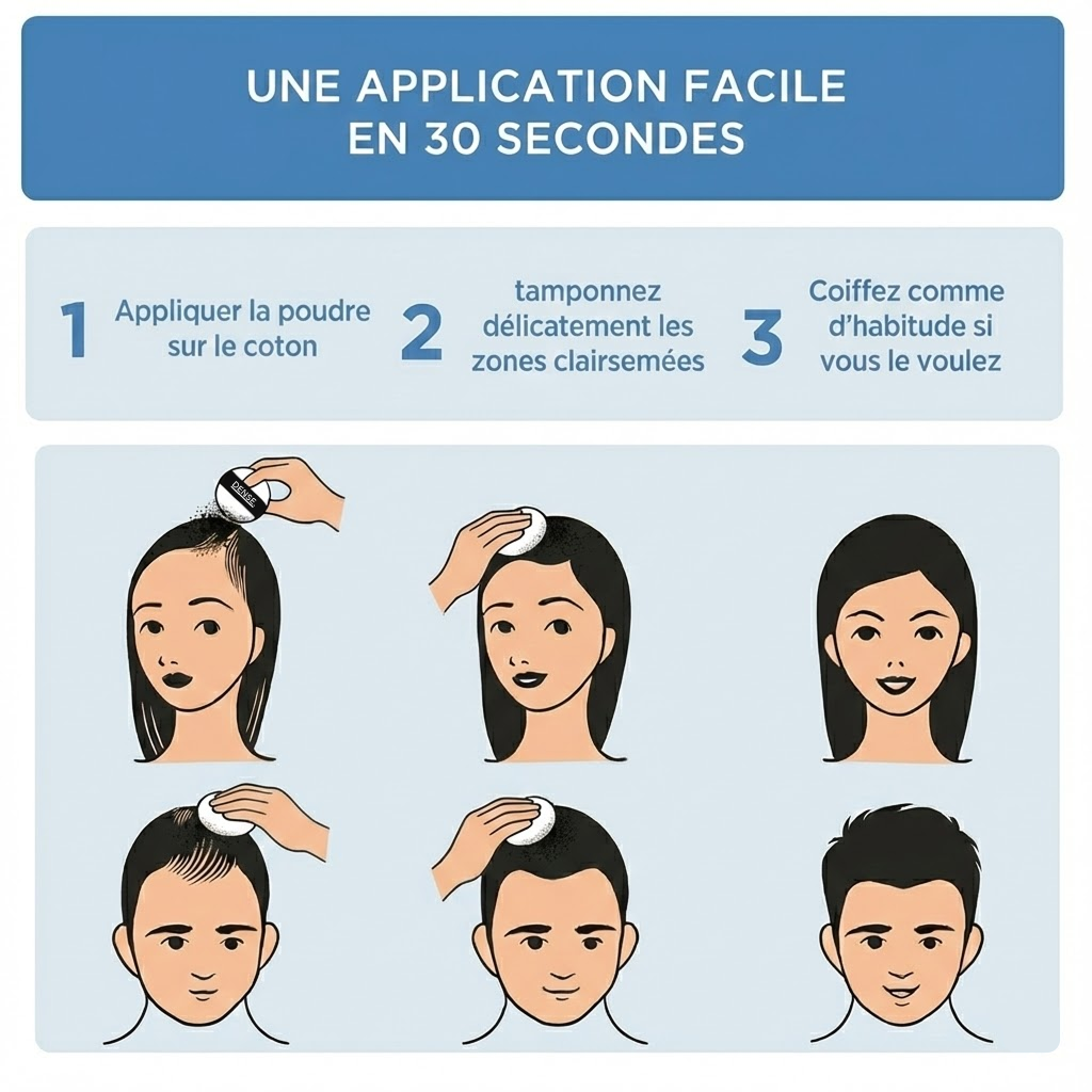 Totalement invisible – sauf si vous décidez de le dire. La poudre fusionne avec vos cheveux existants, même sous une lumière vive ou de très près. La texture imite la densité naturelle, sans effet "matière" ni brillance artificielle. Personne ne le remarquera.